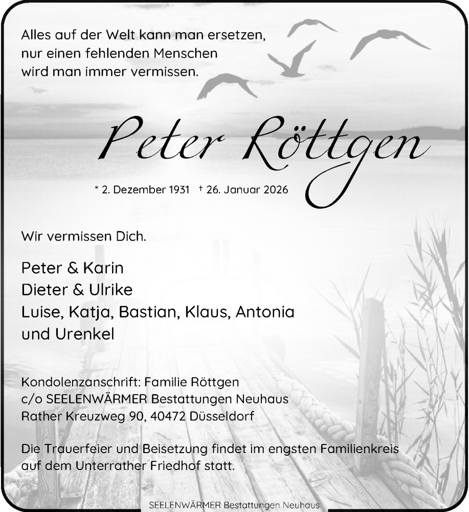 Hier finden Sie alle Traueranzeigen aus der Zeitung, die bisher für Peter Röttgen erschienen sind. Weitere Traueranzeigen, die in der Zeitung erscheinen, werden hier ebenfalls aufgelistet