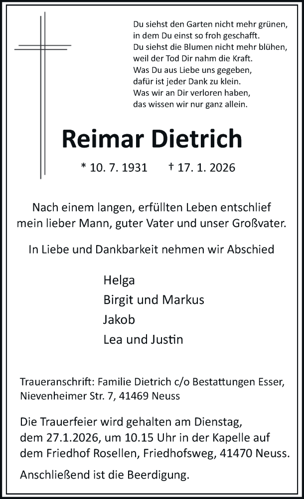 Hier finden Sie alle Traueranzeigen aus der Zeitung, die bisher für Reimar Dietrich erschienen sind. Weitere Traueranzeigen, die in der Zeitung erscheinen, werden hier ebenfalls aufgelistet