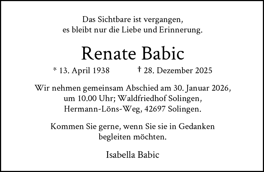 Hier finden Sie alle Traueranzeigen aus der Zeitung, die bisher für Renate Babic erschienen sind. Weitere Traueranzeigen, die in der Zeitung erscheinen, werden hier ebenfalls aufgelistet