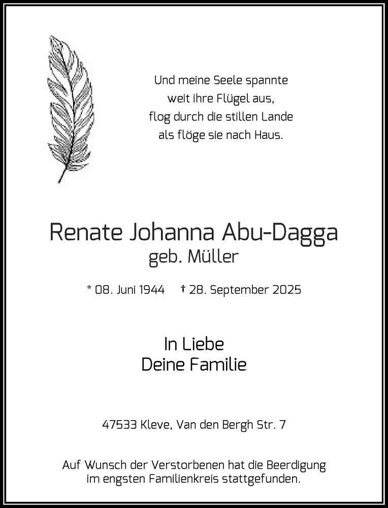 Hier finden Sie alle Traueranzeigen aus der Zeitung, die bisher für Renate Johanna Abu-Dagga erschienen sind. Weitere Traueranzeigen, die in der Zeitung erscheinen, werden hier ebenfalls aufgelistet