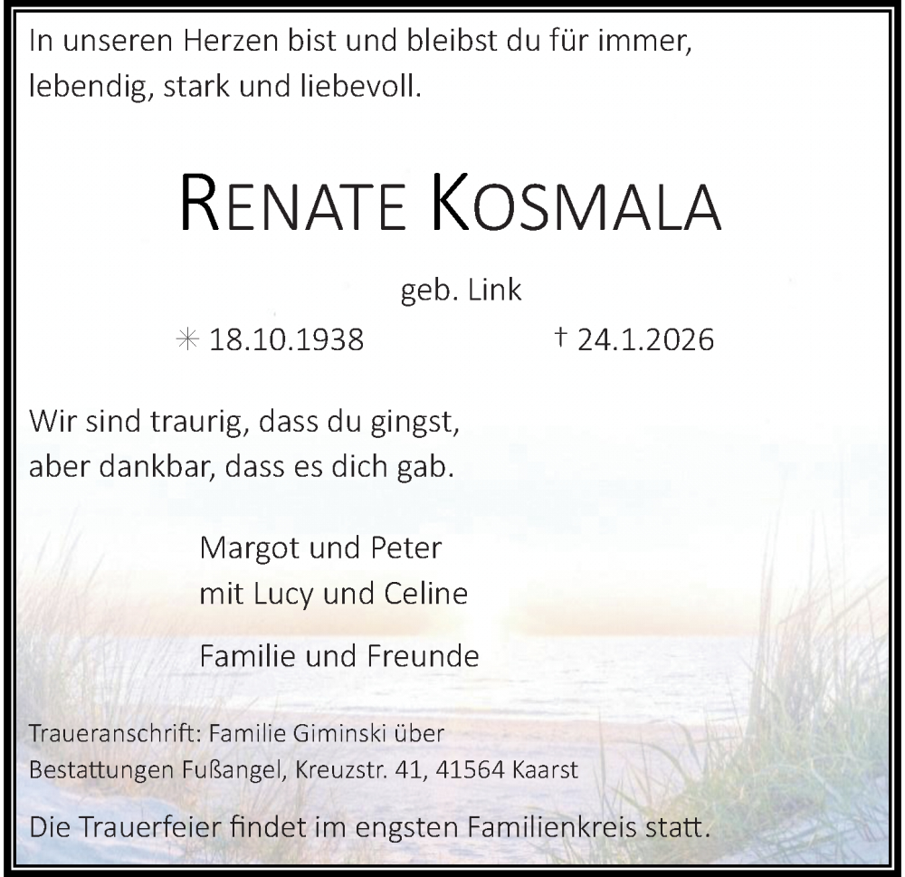 Hier finden Sie alle Traueranzeigen aus der Zeitung, die bisher für Renate Kosmala erschienen sind. Weitere Traueranzeigen, die in der Zeitung erscheinen, werden hier ebenfalls aufgelistet
