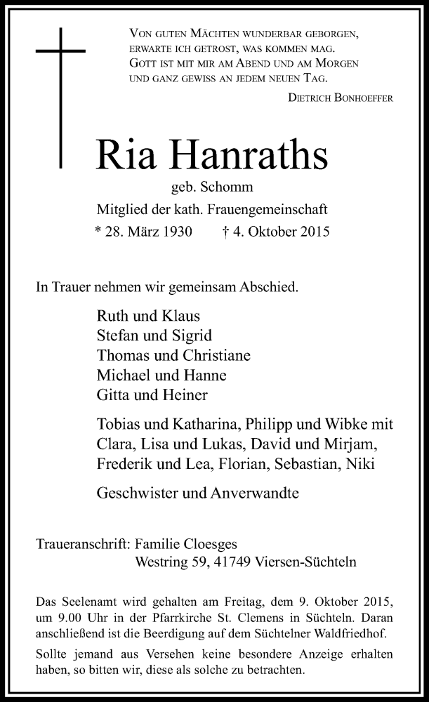 Hier finden Sie alle Traueranzeigen aus der Zeitung, die bisher für Ria Hanraths erschienen sind. Weitere Traueranzeigen, die in der Zeitung erscheinen, werden hier ebenfalls aufgelistet