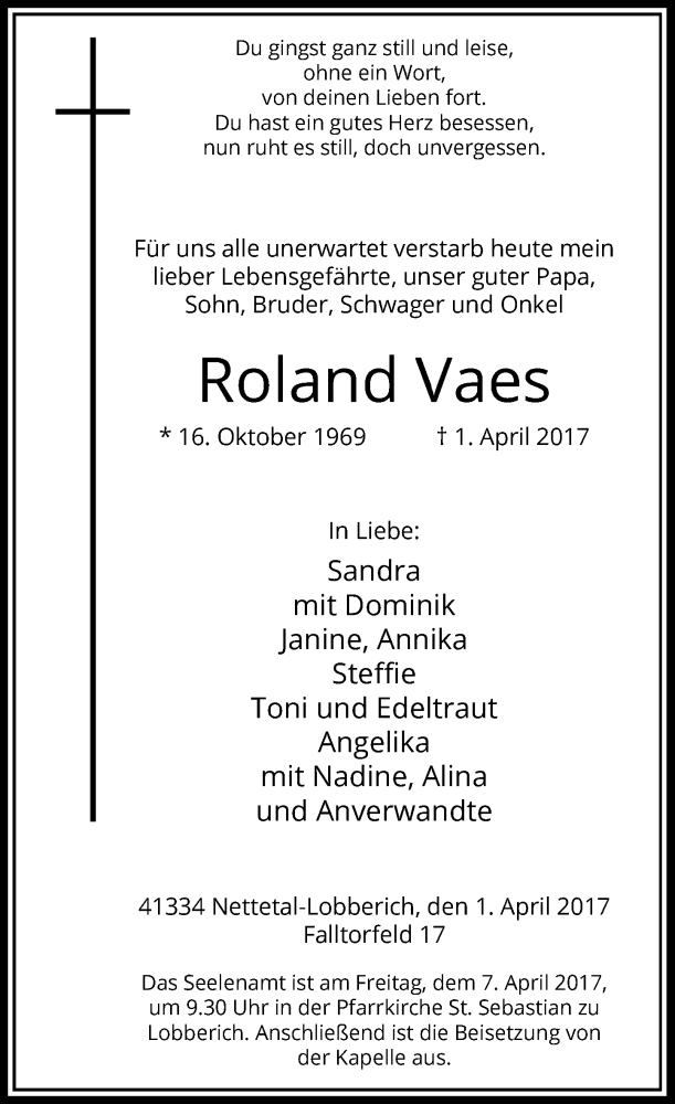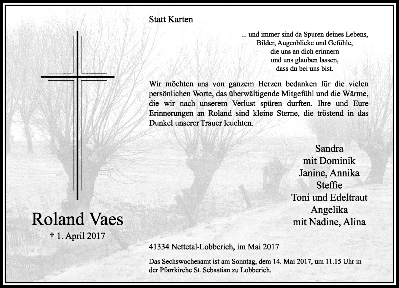 Hier finden Sie alle Traueranzeigen aus der Zeitung, die bisher für Roland Vaes erschienen sind. Weitere Traueranzeigen, die in der Zeitung erscheinen, werden hier ebenfalls aufgelistet