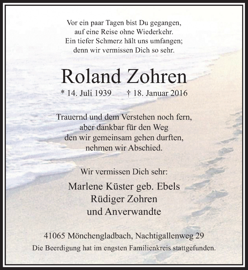 Hier finden Sie alle Traueranzeigen aus der Zeitung, die bisher für Roland Zohren erschienen sind. Weitere Traueranzeigen, die in der Zeitung erscheinen, werden hier ebenfalls aufgelistet