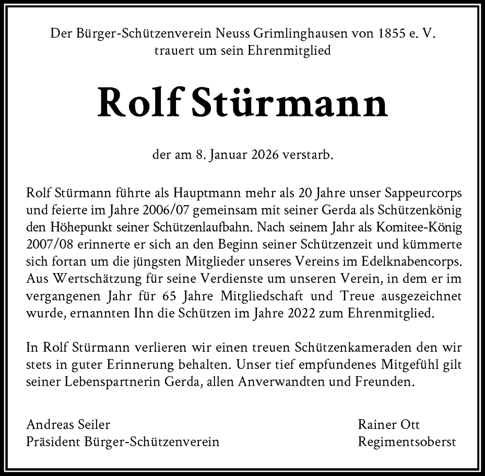 Hier finden Sie alle Traueranzeigen aus der Zeitung, die bisher für Rolf Stürmann erschienen sind. Weitere Traueranzeigen, die in der Zeitung erscheinen, werden hier ebenfalls aufgelistet