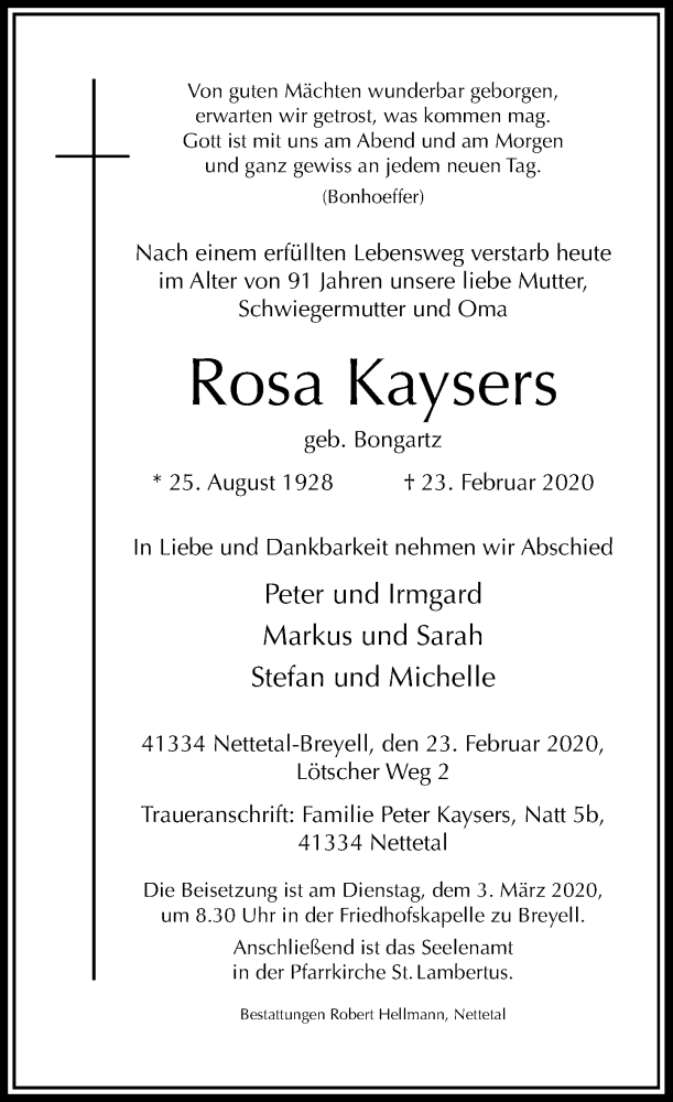 Hier finden Sie alle Traueranzeigen aus der Zeitung, die bisher für Rosa Kaysers erschienen sind. Weitere Traueranzeigen, die in der Zeitung erscheinen, werden hier ebenfalls aufgelistet