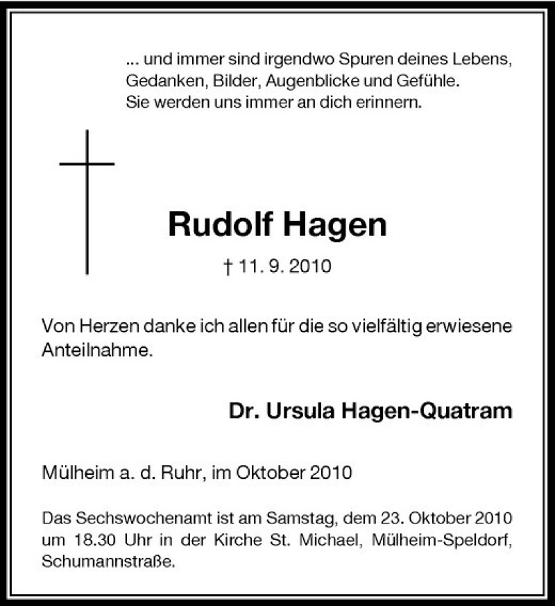 Hier finden Sie alle Traueranzeigen aus der Zeitung, die bisher für Rudolf Hagen erschienen sind. Weitere Traueranzeigen, die in der Zeitung erscheinen, werden hier ebenfalls aufgelistet