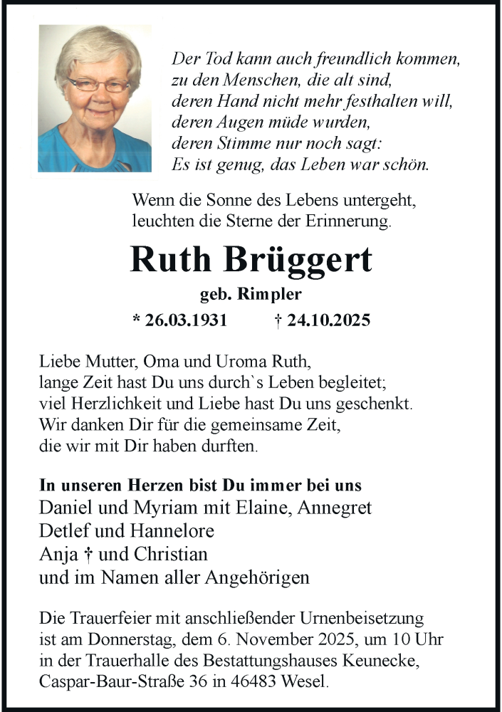 Hier finden Sie alle Traueranzeigen aus der Zeitung, die bisher für Ruth Brüggert erschienen sind. Weitere Traueranzeigen, die in der Zeitung erscheinen, werden hier ebenfalls aufgelistet
