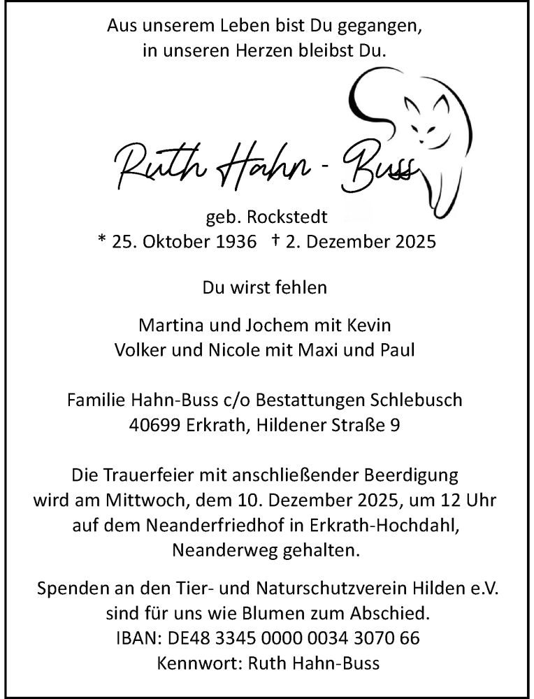 Hier finden Sie alle Traueranzeigen aus der Zeitung, die bisher für Ruth Hahn-Buss erschienen sind. Weitere Traueranzeigen, die in der Zeitung erscheinen, werden hier ebenfalls aufgelistet