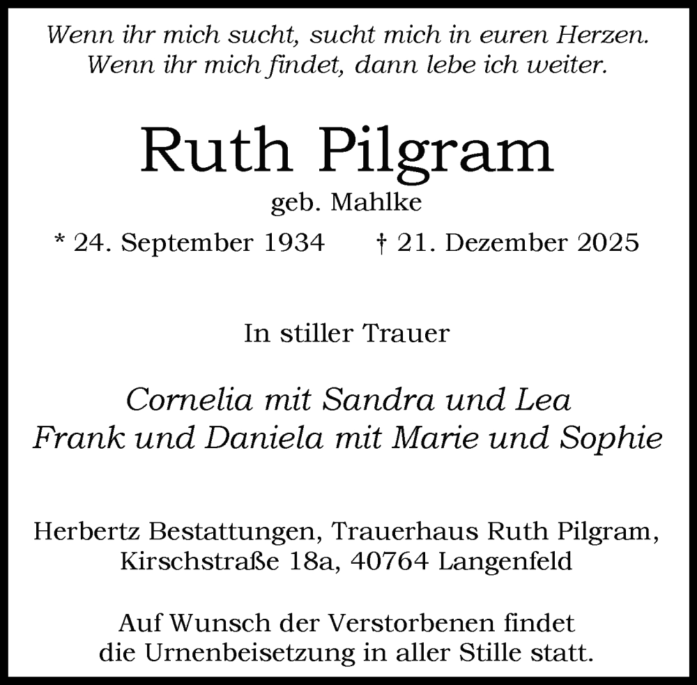 Hier finden Sie alle Traueranzeigen aus der Zeitung, die bisher für Ruth Pilgram erschienen sind. Weitere Traueranzeigen, die in der Zeitung erscheinen, werden hier ebenfalls aufgelistet
