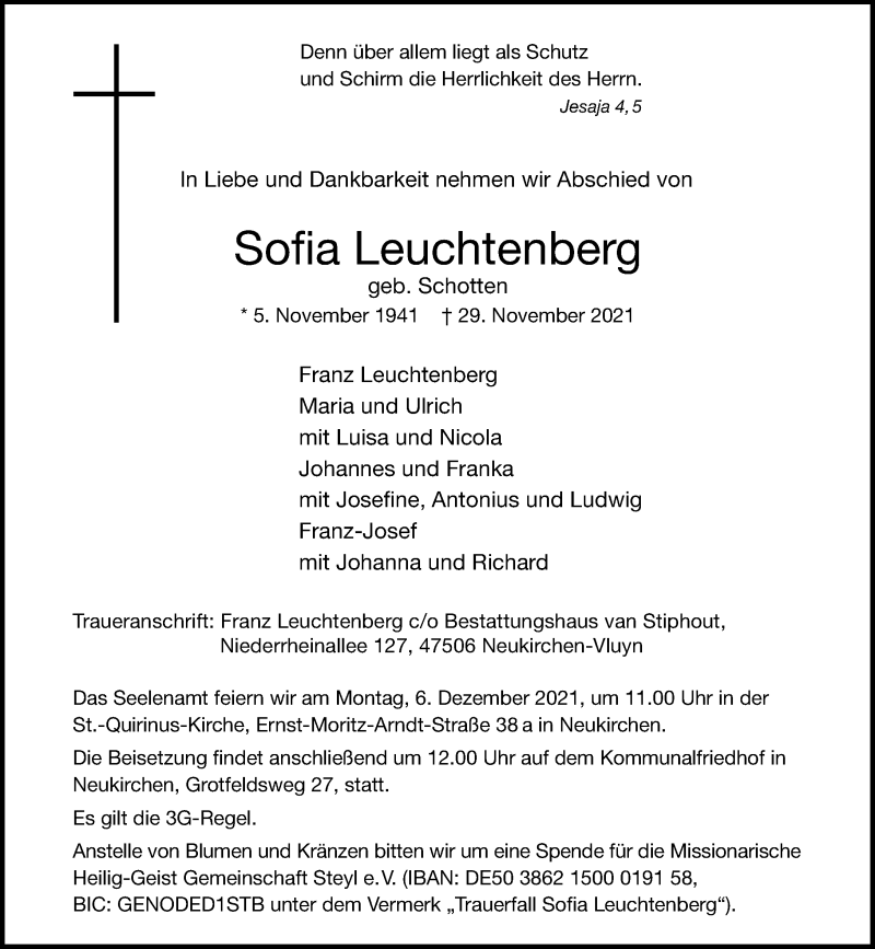 Hier finden Sie alle Traueranzeigen aus der Zeitung, die bisher für Sofia Leuchtenberg erschienen sind. Weitere Traueranzeigen, die in der Zeitung erscheinen, werden hier ebenfalls aufgelistet