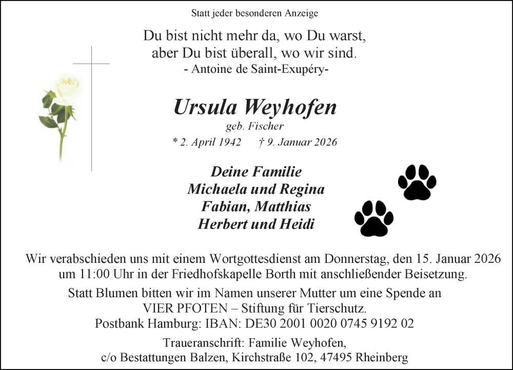 Hier finden Sie alle Traueranzeigen aus der Zeitung, die bisher für Ursula Weyhofen erschienen sind. Weitere Traueranzeigen, die in der Zeitung erscheinen, werden hier ebenfalls aufgelistet