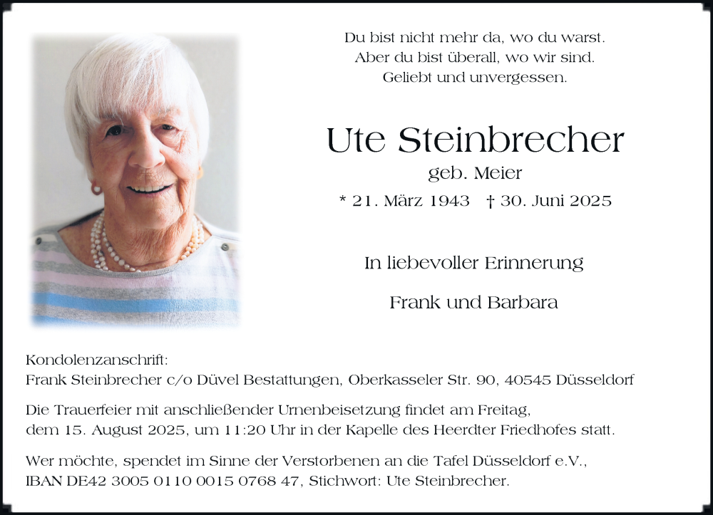 Hier finden Sie alle Traueranzeigen aus der Zeitung, die bisher für Ute Steinbrecher erschienen sind. Weitere Traueranzeigen, die in der Zeitung erscheinen, werden hier ebenfalls aufgelistet
