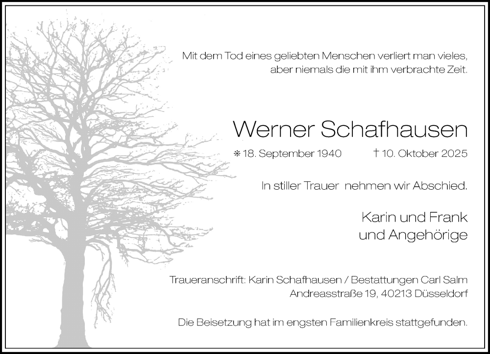 Hier finden Sie alle Traueranzeigen aus der Zeitung, die bisher für Werner Schafhausen erschienen sind. Weitere Traueranzeigen, die in der Zeitung erscheinen, werden hier ebenfalls aufgelistet