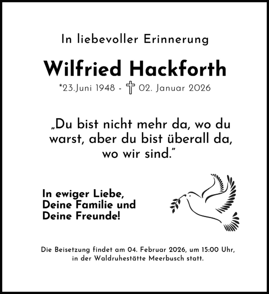 Hier finden Sie alle Traueranzeigen aus der Zeitung, die bisher für Wilfried Hackforth erschienen sind. Weitere Traueranzeigen, die in der Zeitung erscheinen, werden hier ebenfalls aufgelistet