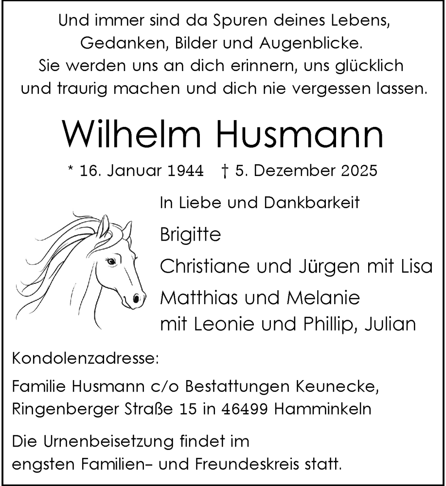 Hier finden Sie alle Traueranzeigen aus der Zeitung, die bisher für Wilhelm Husmann erschienen sind. Weitere Traueranzeigen, die in der Zeitung erscheinen, werden hier ebenfalls aufgelistet