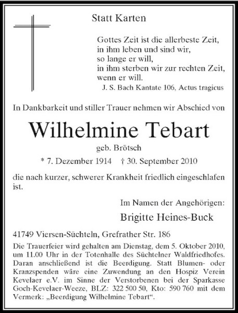 Hier finden Sie alle Traueranzeigen aus der Zeitung, die bisher für Wilhelmine Tebart erschienen sind. Weitere Traueranzeigen, die in der Zeitung erscheinen, werden hier ebenfalls aufgelistet