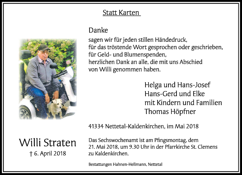 Hier finden Sie alle Traueranzeigen aus der Zeitung, die bisher für Willi Straten erschienen sind. Weitere Traueranzeigen, die in der Zeitung erscheinen, werden hier ebenfalls aufgelistet