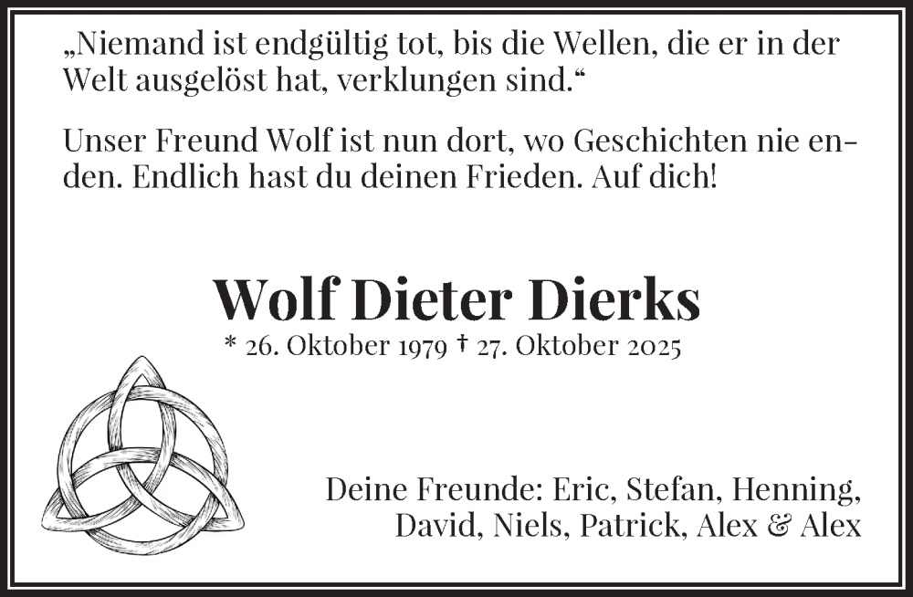 Hier finden Sie alle Traueranzeigen aus der Zeitung, die bisher für Wolf Dieter Dierks erschienen sind. Weitere Traueranzeigen, die in der Zeitung erscheinen, werden hier ebenfalls aufgelistet