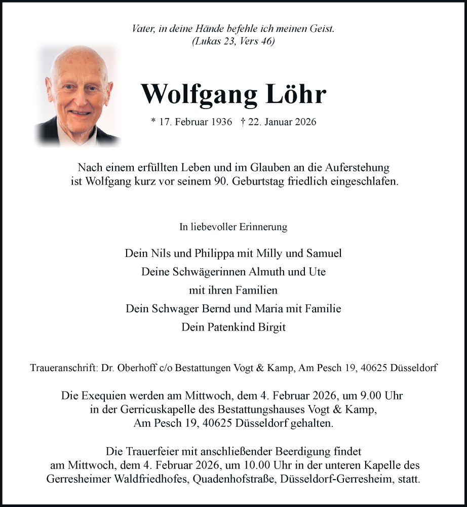 Hier finden Sie alle Traueranzeigen aus der Zeitung, die bisher für Wolfgang Löhr erschienen sind. Weitere Traueranzeigen, die in der Zeitung erscheinen, werden hier ebenfalls aufgelistet